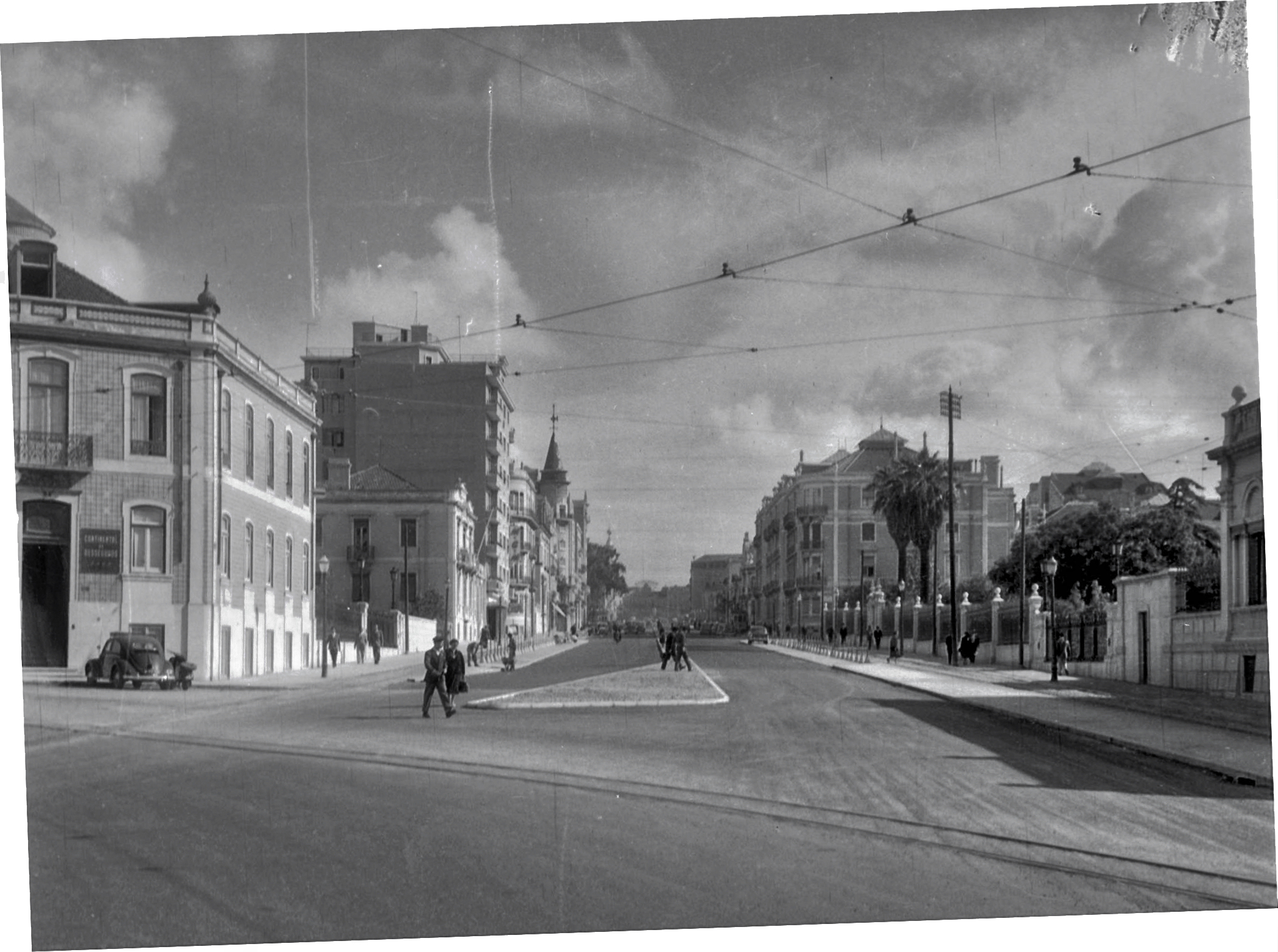 Sugeriu o leitor Mário Cruz no Solar da família Mayer um «antes e depois» com esta de Judah Benoliel. Antes, em 1901, a Av. de Fontes exibia placa central arborizada em jeito de boulevard, com gente elegante em promenade; depois, por moda ou progresso (ou pela moda do progresso) obliterando-se as árvens em prol do desafogo rodoviário. Ainda assim foi um depois só ainda premonitório do tráfego a haver, pois vedes que não havia...