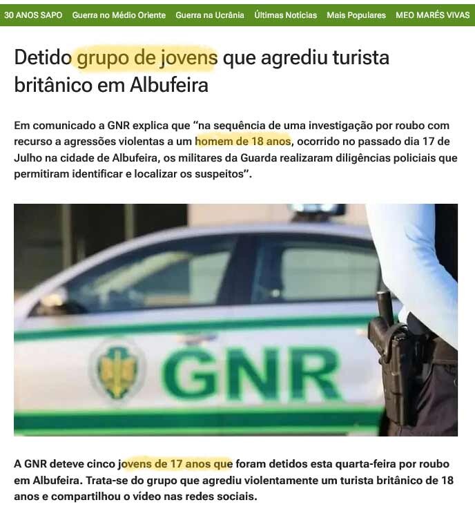 Leio que um bando de ladrões violentos de 17 anos é um… grupo de jovens. Um simples, irresponsável, desculpável até… — tudo inculcas dum jornalismo vicioso e manipulador das mentes — grupo de jovens.