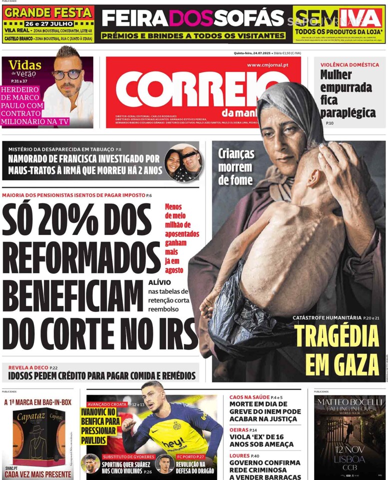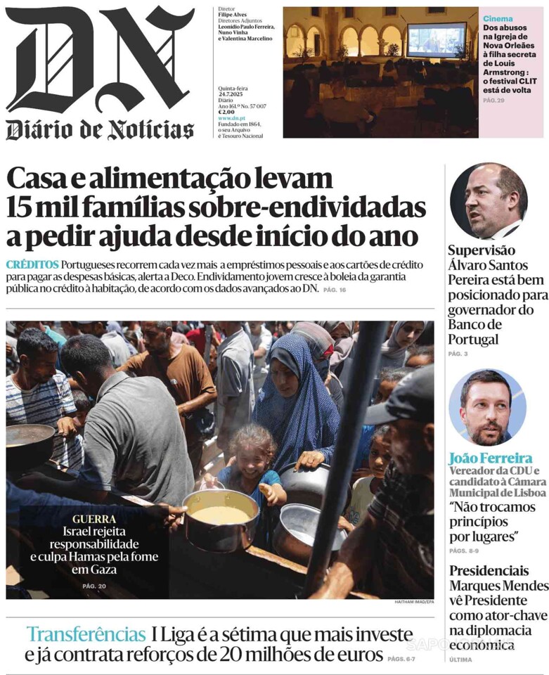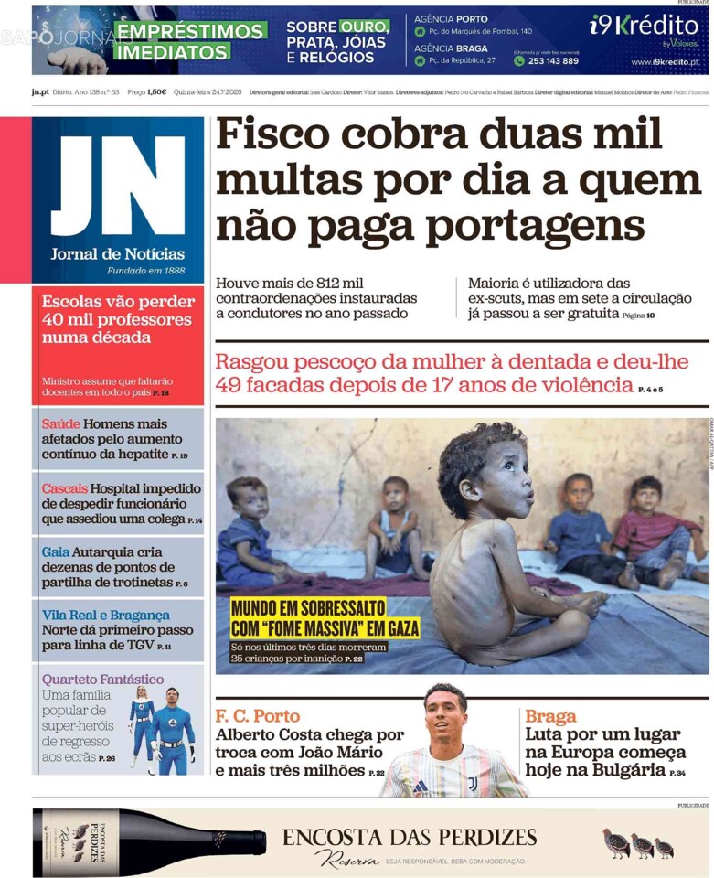 No mundo inteiro não há só criancinhas a morrer de fome em Gaza, mas notícia para hoje são só elas. As imagens em primeira página berram horror e inculcam recados: — Israel rejeita responsabilidade e culpa Hamas… (o D.N. distribui as culpas); Mundo em sobressalto com «fome massiva» em Gaza. Só nos últimos três dias morreram 25 crianças por inanição (o J.N., põe umas aspas na «fome massiva» [i.é, maciça], talvez porque achou pouco 25 crianças, será?…); Tragédia em Gaza: crianças morrem de fome (o C.M. narra o facto, simplesmente); o Público remete a encomenda para a esquerda baixa, e desvenda quem encomendou: — A Unicef denuncia… — Uma verdadeira notícia dentro da notícia…