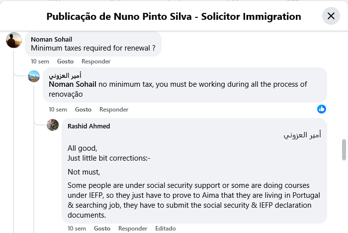 Rashid Ahmed [ = Muito Louvado Beato] — Tudo certo, com algumas correcçõezinhas: não é obrigatório [estar a trabalhar — ou empregado, digo eu]; alguns que recebam da Segurança Social ou estejam em cursos do I.E.F.P., esses basta-lhes provar à A.I.M.A. que estão a viver em Portugal e à procura de emprego [cá está!], enviando declaração de prova da Segurança Social e do I.E.F.P.